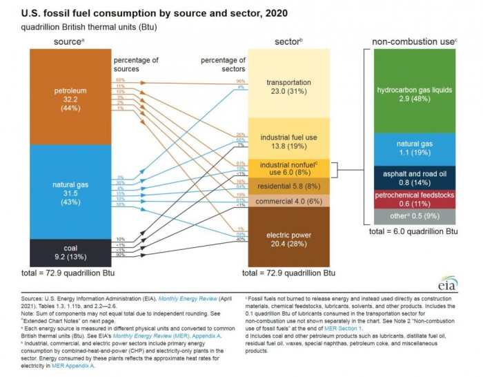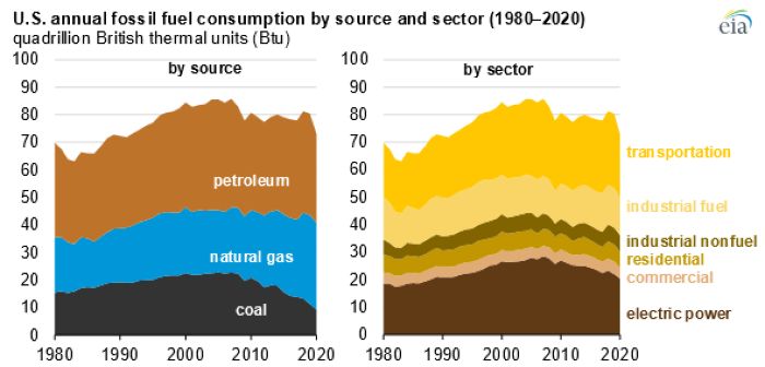 根据美国能源信息管理局(EIA)公布的最新数据,2020 年美国人在化石燃料上的消耗是 30 年来最低的。与 2019 年相比,去年的石油、天然气和煤炭消费下降了 9%,这是 EIA 自 1949 年开始记录以来最大的年度降幅。