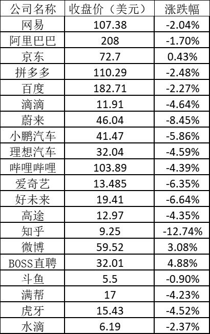其它热门中概股普遍下跌,其中滴滴下跌4.64%,斗鱼下跌0.90%,知乎下跌12.74%,哔哩哔哩下跌4.39%,满帮下跌4.23%,百度下跌2.27%,微博逆市上涨3.08%,BOSS直聘上涨4.88%