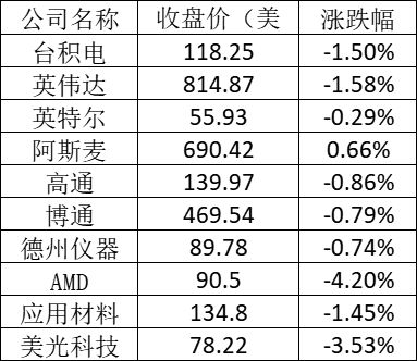 美股中的主要芯片股表现如下: