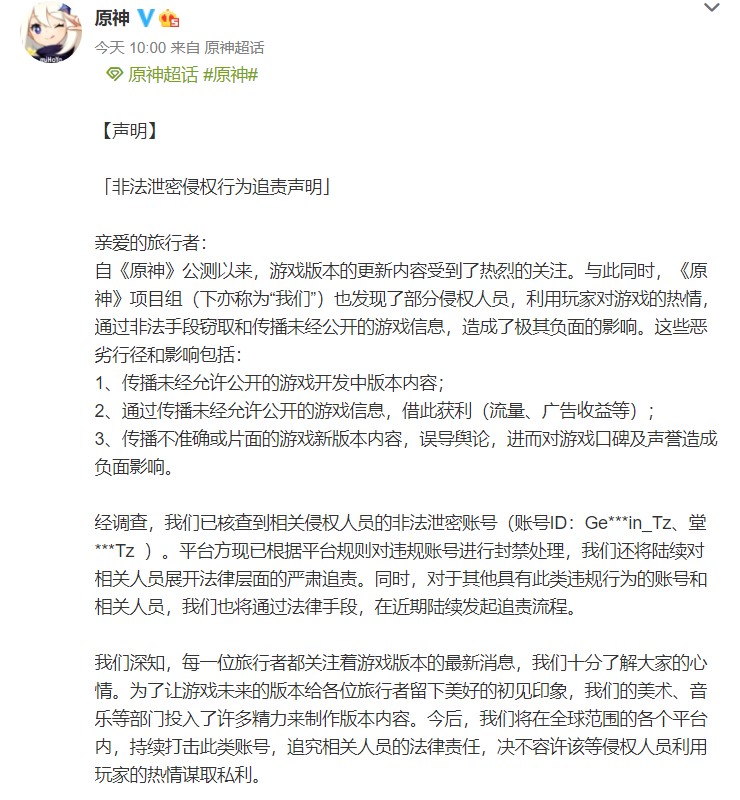 经调查,我们已核查到相关侵权人员的非法泄密账号(账号ID:Ge***in_Tz、堂***Tz )。平台方现已根据平台规则对违规账号进行封禁处理,我们还将陆续对相关人员展开法律层面的严肃追责。同时,对于其他具有此类违规行为的账号和相关人员,我们也将通过法律手段,在近期陆续发起追责流程。