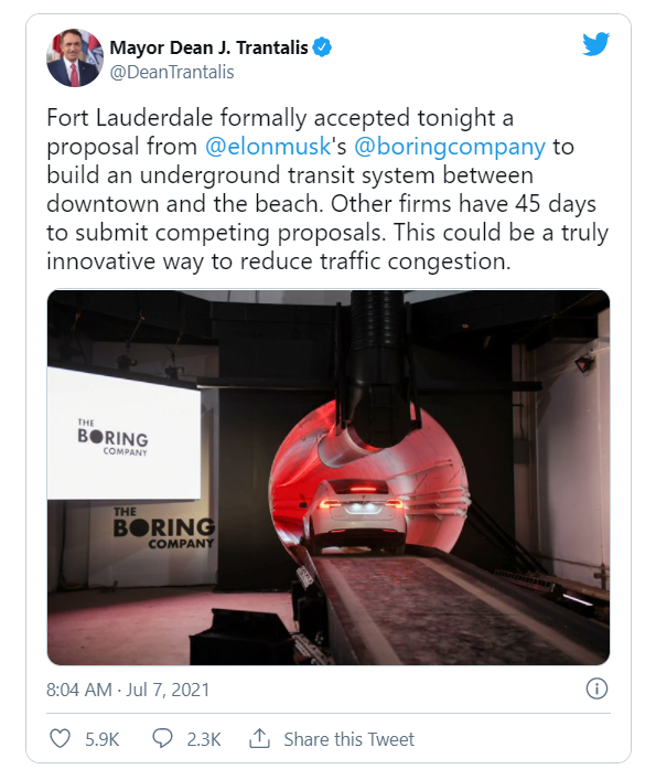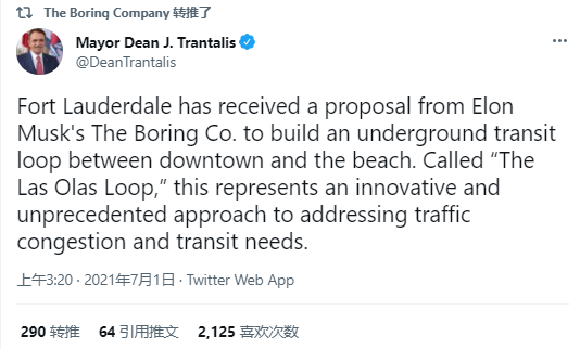 据外媒CNET报道,Boring公司可能很快就会在佛罗里达州挖掘隧道。据劳德代尔堡市长Dean J. Trantalis称,埃隆·马斯克(Elon Musk)的隧道工程公司竞标了该市新的交通系统的合同。Trantalis在发推文确认了这一投标,路透社在周三晚上首次报道了这一消息。