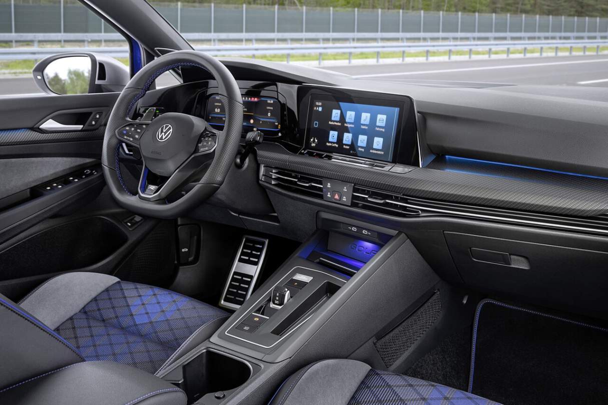 在内部,内部没有传统的物理按钮代替触摸按钮和滑块。标准设备包括一个新的多功能运动皮革方向盘、高级运动座椅、大众的MIB3信息娱乐系统和R专用的数字座舱专业仪表集群。