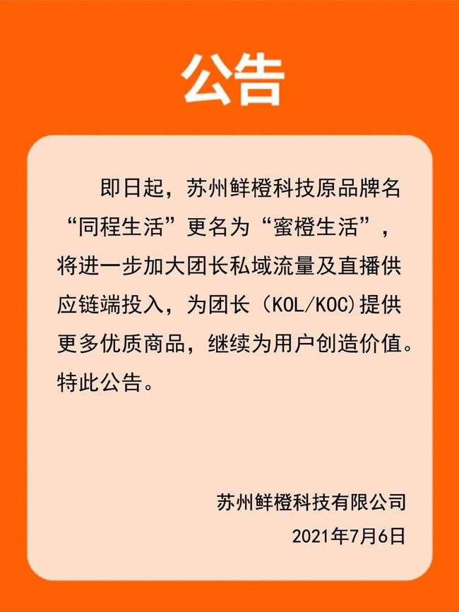 7月6日凌晨,何鹏宇发布公开信,请求合作方再给同程生活一些时间。公开信提到,鲜橙科技正面临着创业以来最困难的时刻,必须做出战略上转型调整。“即日起启用新的品牌名‘蜜橙生活’,围绕团长(KOL、KOC)进行供应链的创新,包括私域流量运营、直播运营、供应链赋能等。”