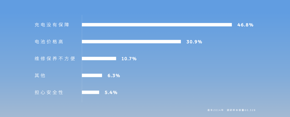 在2014年,李斌还在易车公司任职董事长的时候,它做了一次样本容量超6万的市场调查——“用户对电动车没有兴趣的原因”。结果显示有46.8%的用户认为充电没有保障,其次30.9%的用户认为电池价格高,10.7%的人认为维修保养不方便,5.4%的人担心安全性。