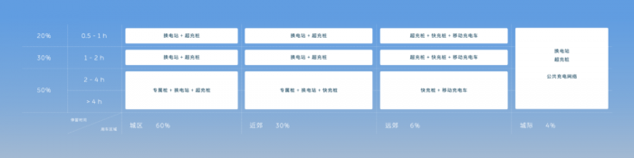 比如,一个高频场景:城区可能占到60%的用车场景,那么对应大于4小时停留时间的地方,最可能是单位/家/酒店。另外一个极端:城际占到4%的用车区域,近停留半小时至一小时的时长,最可能是在大于100公里的旅游景区。那么,针对不同场景,就要用最合适该场景的充电方式。