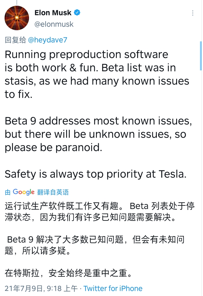 视频中车辆使用的是Beta V9版本的FSD,此前特斯拉CEO马斯克在Twitter上表示,“新用户现在还无法加入FSD(全自动驾驶)的测试版。因为V9测试版中还有很多已知问题和未知问题需要解决,对于最新的测试版还需要存疑。”