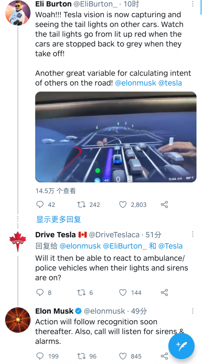 在7月10日特斯拉在美国部分地区开始推送Beta v9版本的FSD(全自动驾驶系统)。有车主在社交媒体分享视频并发文表示,自己的特斯拉可以识别并判断其他车辆的尾灯。对此有网友提问马斯克,能否识别救护车和警车等特殊车辆的灯光并作出反应呢?