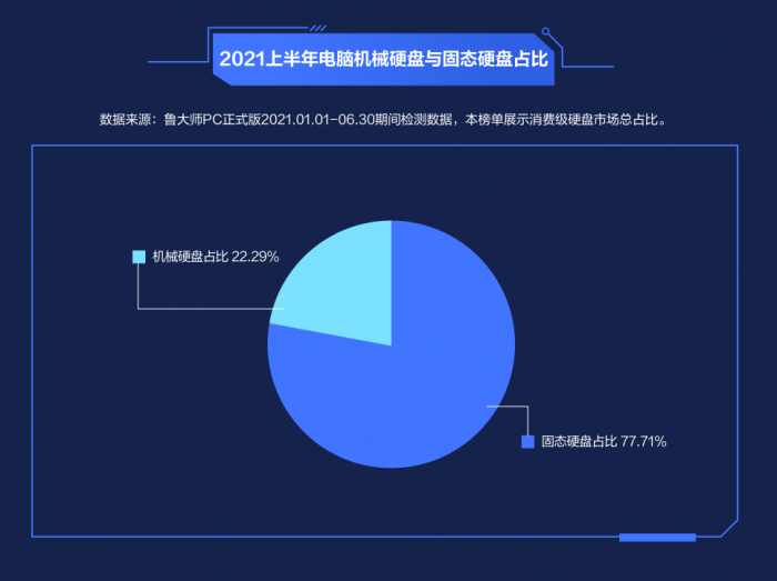 SSD固态硬盘淘汰机械硬盘曾经是很多人津津乐道的一个话题,而从眼下的形势看,二者将会长期并存,分别适用于不同场景,而整体来说SSD无疑是个大头。根据鲁大师发布的2021年上半年PC硬件报告,在鲁大师用户群体中,SSD的比例已经达到77.71%,机械硬盘则跌至22.29%。