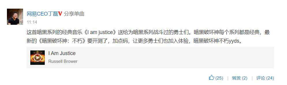 《暗黑破坏神:不朽》国服先锋测试将于7月15日正式开启,玩家们可以自定义角色容貌,在移动端体验纯粹的“暗黑”乐趣。今日网易CEO丁磊在网易云音乐发布动态,分享了暗黑系列经典音乐《I am justice》,同时他表示《暗黑破坏神:不朽》即将开测,要加点码,让更多玩家加入测试。