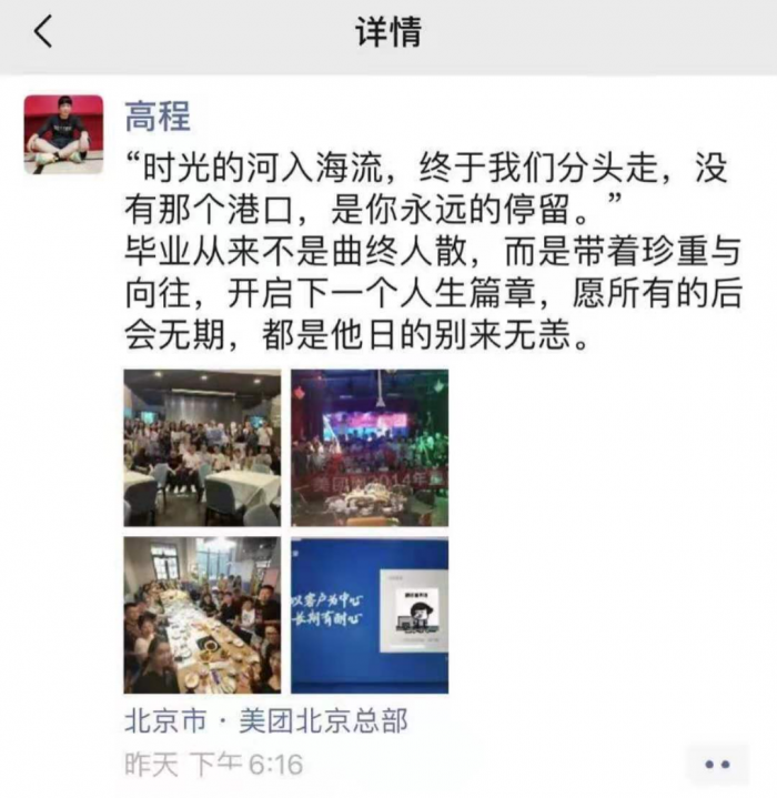 根据脉脉的个人主页信息显示,高程于2011年6月加入美团,从BD销售一路做起,先后任美团城市经理、区域经理、市场部经理、销售运营经理,离职前的职务为美团充电宝销售中心负责人。据消息人士称,“销售中心负责人就是部门的最高领导。”