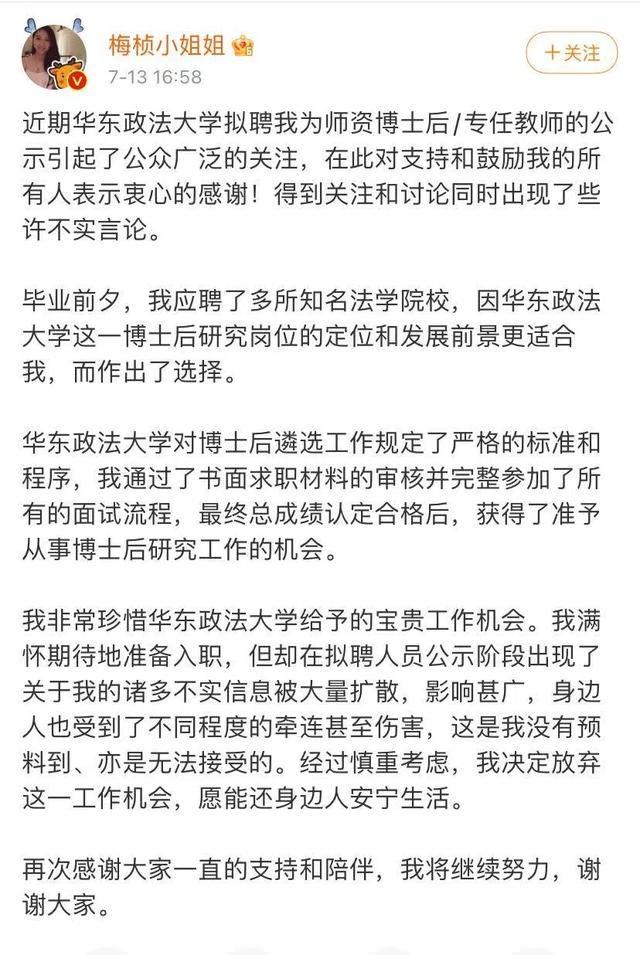 曾因职场综艺走红的梅桢,出现在某高校专任教师拟聘人员公示名单上,引发网友不满。13日,梅桢发文称自己决定放弃任教机会,“我满怀期待地准备入职,但却在拟聘人员公示阶段出现了关于我的诸多不实信息被大量扩散,影响甚广,身边人也受到了不同程度的牵连甚至伤害,这是我没有预料到、亦是无法接受的。经过慎重考虑,我决定放弃这一工作机会,愿能还身边人安宁生活。”