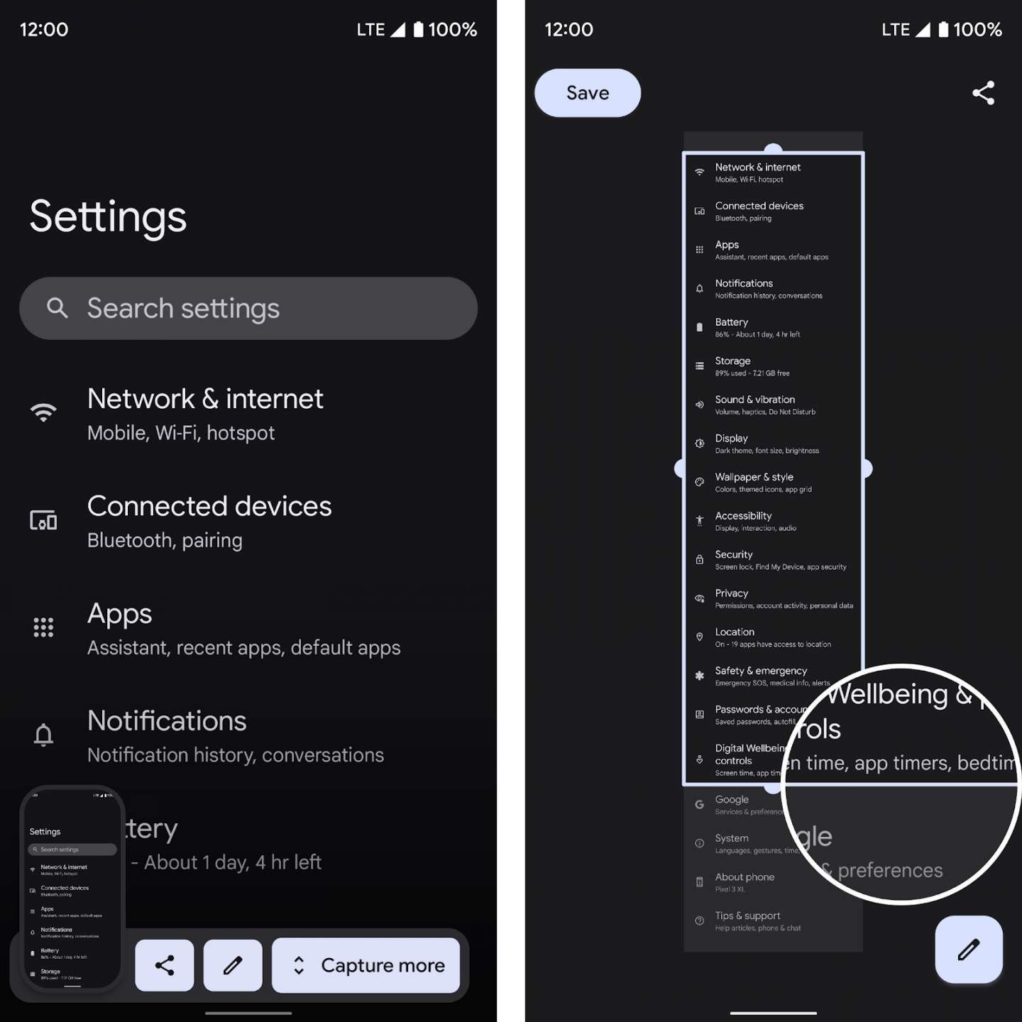 新版本中还增加了一些针对用户的改进,例如滚动截屏功能。在 Android 12 上可以原生支持长图截屏。这是目前很多第三方手机厂商提供的功能,而现在Google将其纳入到 Android 12 系统中。现在当你截图的时候,会跳出一个“Capture more”按钮,会自动滚动当前页面截取更多内容。