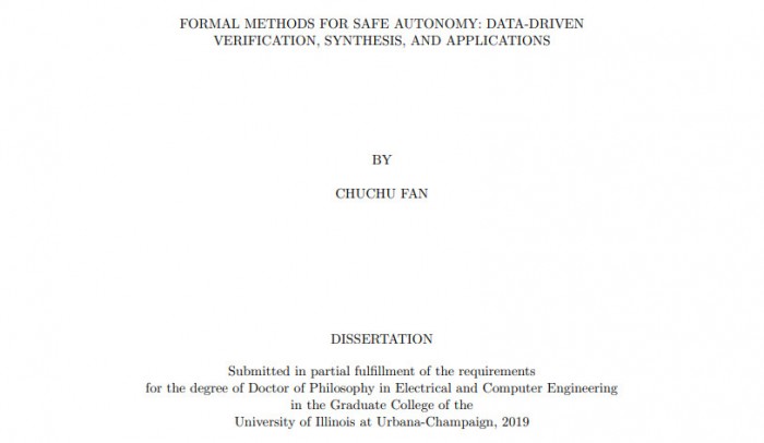 范楚楚的获奖工作为 2019 年从 UIUC 获得博士学位的论文,题目是“Formal Methods for Safe Autonomy: Data-Driven Verification, Synthesis, and Applications”,入选理由是:这篇工作为嵌入式与信息物理系统的验证做出了奠基性贡献,且展示了该技术应用于工业系统的可能性。
