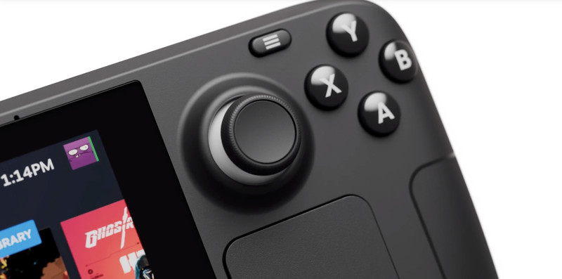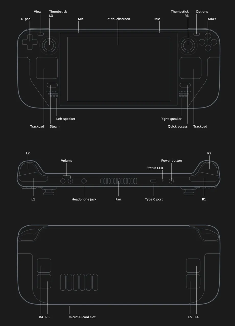 作为掌机,Steam Deck机身有大量的控制选项,有两个拇指杆,拇指杆下面有两个小触控板,ABXY按钮,一个D-pad和一个7英寸触摸屏。该设备也有一个用于运动控制的陀螺仪。与Switch一样,它在每侧有两个肩部触发器,还有四个背部按钮(每侧两个)。
