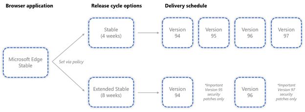 Edge 团队今天表示:“如果组织选择 Microsoft Edge 94 的 8 周‘扩展稳定’发布周期,他们将收到 Microsoft Edge 96、Microsoft Edge 98 等的后续功能更新。虽然功能更新将根据选定的发布周期打包并随新版本发布一起发布,但重要的安全补丁和修复将根据需要独立于选定的发布选项交付,以帮助维护浏览器安全性”。