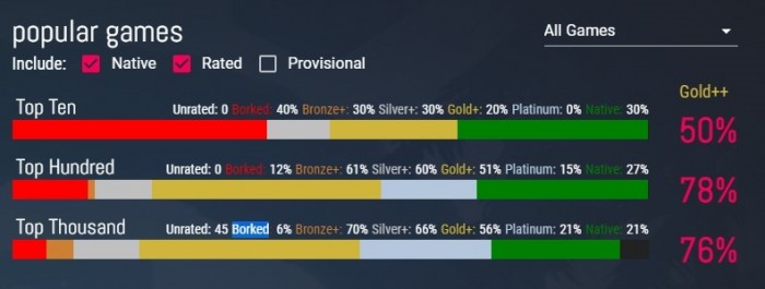 吐槽Linux系统则大可不必,Valve几年前就开始深耕Linux游戏,不仅第一方作品原生支持Linux,还搞了一个名为Proton的兼容层设法使Linux操作系统支持Windows游戏,Steam热门游戏前一百名仅有12%的游戏无法运行,前一千款热门游戏只有6%无法运行: