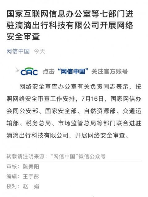 7月16日消息,据“网信中国”消息,网络安全审查办公室有关负责同志表示,按照网络安全审查工作安排,7月16日,国家网信办会同公安部、国家安全部、自然资源部、交通运输部、税务总局、市场监管总局等部门联合进驻滴滴出行科技有限公司,开展网络安全审查。