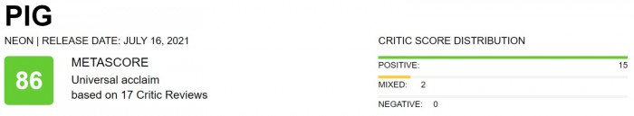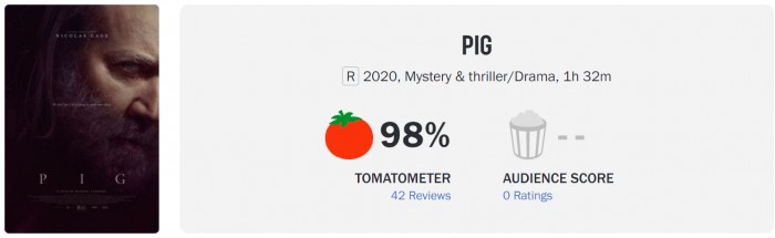 电影《救猪行动》中,凯奇饰演一名搜寻松露的人,住在俄勒冈的荒野。他最爱的猪觅食时被人绑架,为找回它,他必须一路去到波特兰,并重新直面自己过去的人生。影片将于7月16日北美上映,目前烂番茄新鲜度98%(42评),MetaCritic均分86分(17评),口碑不俗。