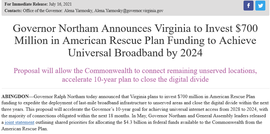 Northam在一份声明中说:"是时候缩小我们联邦的数字鸿沟了,并把互联网服务当作21世纪的必需品来对待,它不仅仅是某些人的奢侈品,而是所有人的基本工具。这场大流行加强了高质量的宽带对健康、教育和经济机会的重要性,我们不能让任何社区落后。"