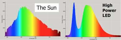 下图就是太阳光与LED屏的光谱对比,差异显而易见。太阳光蓝光波长均匀,且主要以长波蓝光为主,而LED屏的短波蓝光能量极高,远超其它颜色的光谱。