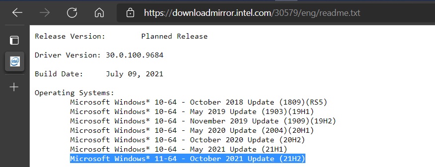 在英特尔DCH GPU驱动30.0.100.9684的发布说明中,英特尔已经明确将Windows 11称为 "2021年10月更新--21H2版"。正如你可能知道的那样,Windows构建被标记为 "YYMM",其中YY代表两位数格式的年份,MM是代表预期发布的月份。