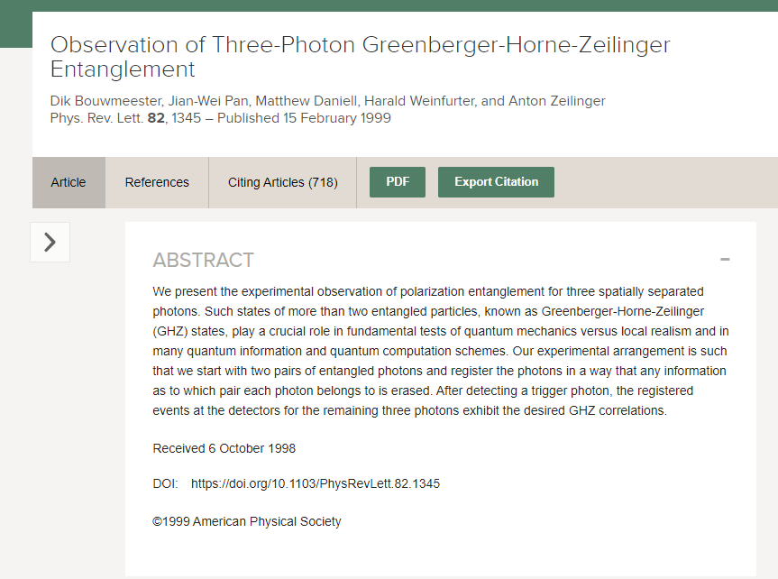 1989年,丹尼尔•格林伯格、迈克尔•霍恩和塞林格三名物理学家对一种名叫GHZ(三人姓氏首字母的结合)的量子态进行了描述。GHZ量子态涉及到四个光子,每个光子都处于0或1两种状态的叠加态上(这种量子态名叫量子比特)。在三人发表的论文中,GHZ状态包含四个相互纠缠的量子比特,整个系统处于一种二维的量子叠加态中,要么为0000,要么为1111。如果对其中一个光子进行测量,发现其处于状态0上,整个叠加态便会坍缩,其它光子的状态也是0;测出的结果为1也是同理。上世纪90年代末,塞林格和同事们首次在实验中观察到了三个量子比特的GHZ态。