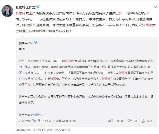 张雨绮工作室也表明,张雨绮按照快手方提供的商品价格及方案完成了直播工作。而具体补贴分配详情,快手与主播在直播活动前后均未告知他们。