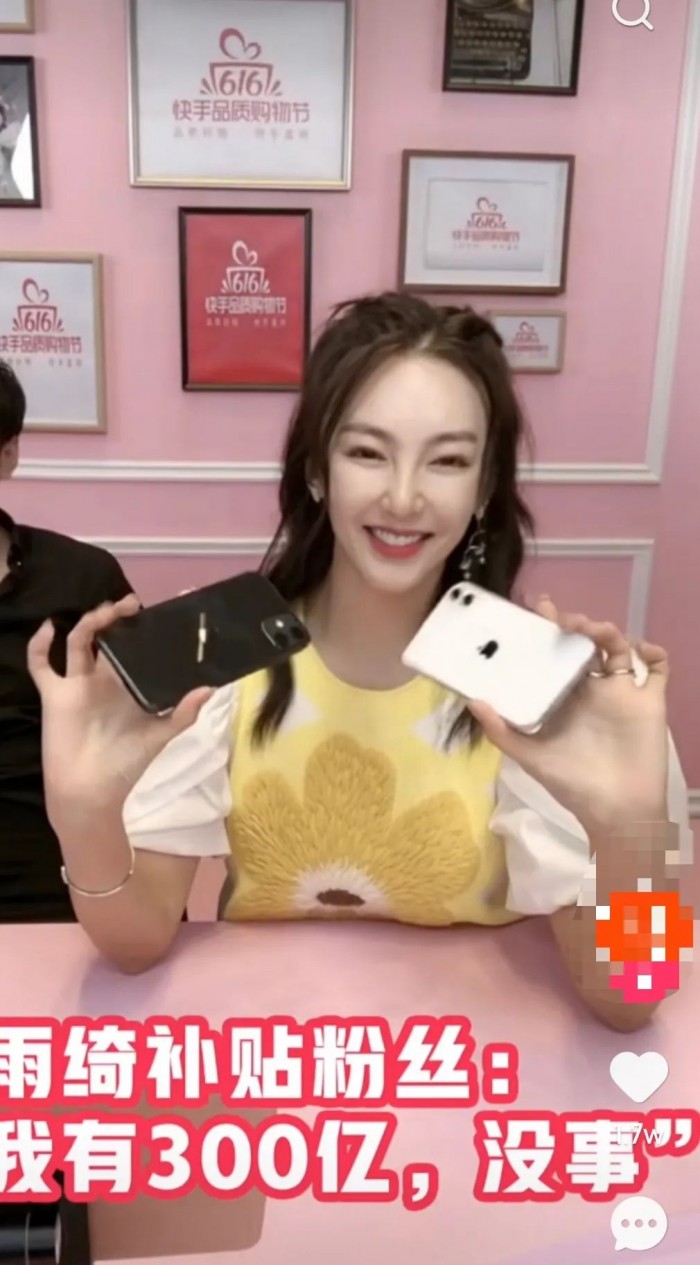 还有人提到,去年张雨绮在快手直播间的补贴争议。当时,张雨绮和主播在卖iPhone11时,将原价4299的手机降价到3899卖,并爽快地表示,差价自己来补。两个多月后,该主播在直播间抱怨,说好为粉丝补差价,张雨绮并没有给钱,自己自掏腰包补了1200万。由此引起双方粉丝掐架。