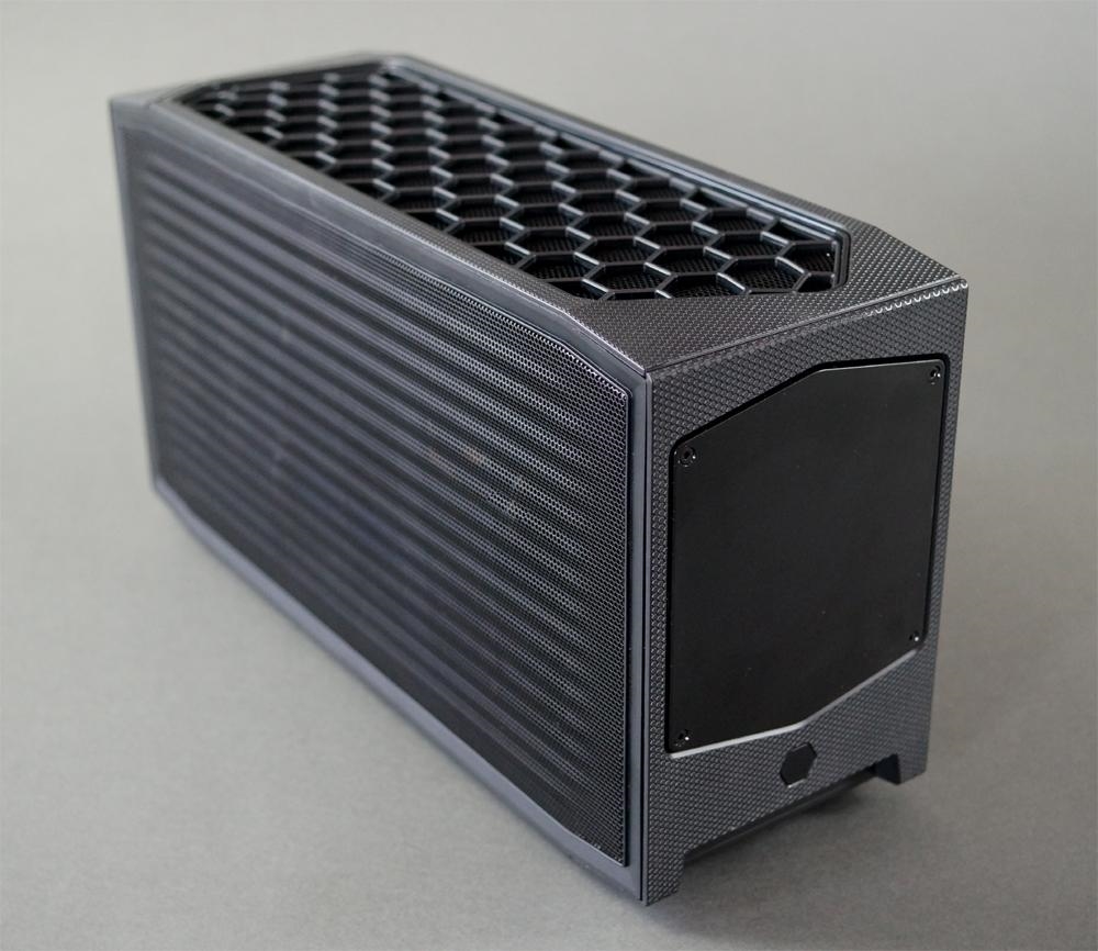 长方体造型,从表面纹理到侧面/顶部网格,再到前面板,到处都是六角形元素,正面的骷髅头标记还支持RGB LED。