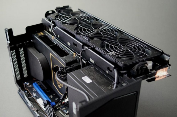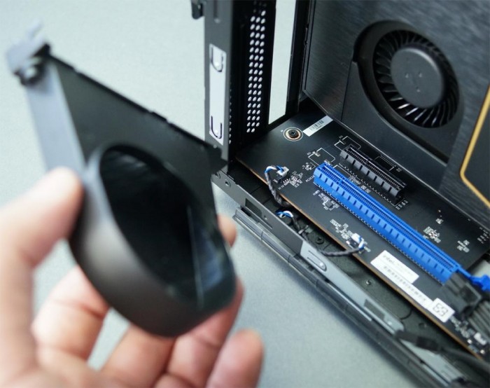 内部布局紧凑,特别是为了容纳显卡,处理器、内存、硬盘、网络都整合在一张PCIe扩展卡形式的计算套件内,也就是左侧绘有骷髅头标识的地方。