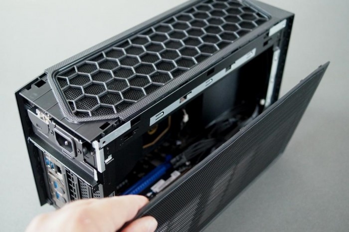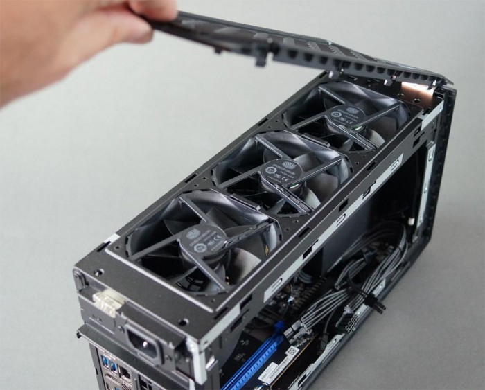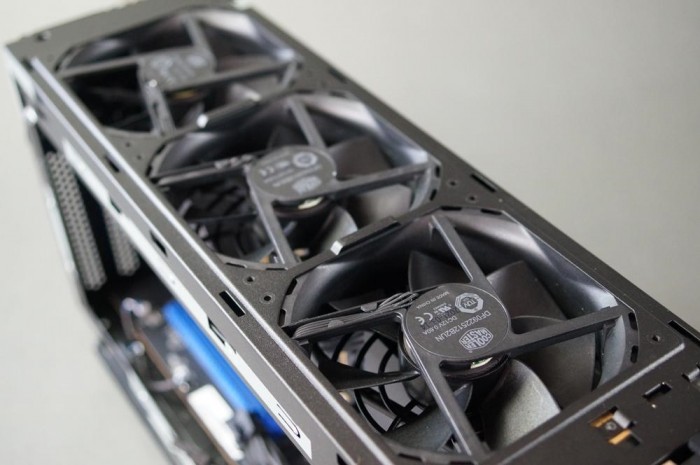 左右侧板和顶部都可以拆开,拿下顶盖就可以看到相当暴力的三个并排风扇,酷冷至尊出品,92mm直径,可自行更换。