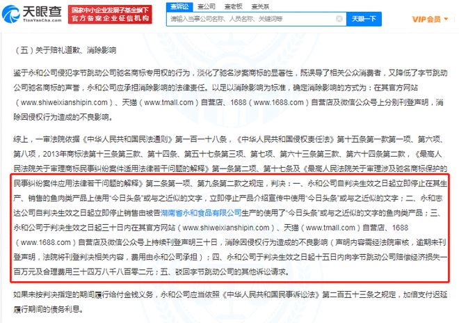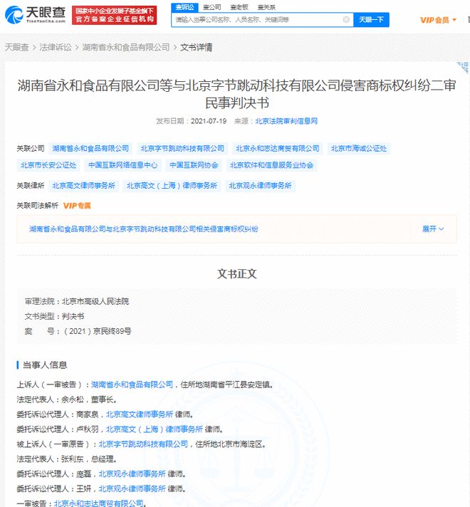 天眼查App显示,7月19日,湖南省永和食品有限公司等与北京字节跳动科技有限公司侵害商标权纠纷二审民事判决书公开,案号(2021)京民终89号,审理法院为北京市高级人民法院。本案裁判结果为驳回上诉,维持原判。本判决为终审判决。