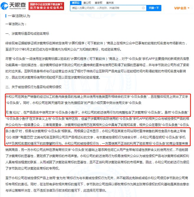 该判决书显示,法院认为,被告永和公司在其生产销售的鱼肉类食品的包装上突出使用与鱼类图形相结合的文字“今日头条鱼”,且在整体视觉、产品介绍上突出文字“今日头条”等行为,极易使相关公众认为被控侵权产品与涉案商标“今日头条”有相当程度的联系。