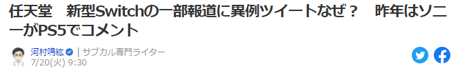 7月19日昨天,任天堂官方突然发推,表示某著名国外媒体推测的新型Switch(配有机EL屏版本)利润比起现行版高的报道毫无事实依据,引发业界哗然,看似没什么太大情绪表现的措辞,实际上蕴含着日式的愤怒,而这个愤怒,去年的索尼也曾经经历过。