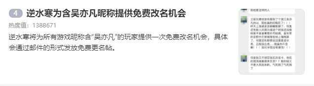 今日(7月20日)游戏《逆水寒》官方微博发文表示:“将为所有游戏昵称含有‘吴亦凡’的玩家提供一次免费改名机会,具体会通过邮件的影视发放免费更名贴”并且在这条微博中还配有玩家微信投诉截图,目前该事已经登上本日的微博热搜榜。