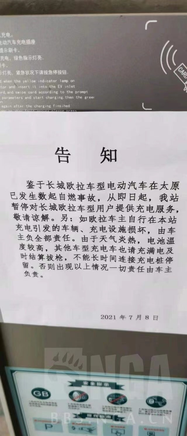 其上称:鉴于长城欧拉车型电动汽车在太原已发生数起自燃事故,从即日起,我站暂停对长城欧拉车型用户提供充电服务,敬请谅解。如欧拉车主自行在本站充电引发的车辆、充电设施损坏,由车主负全部责任。