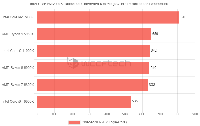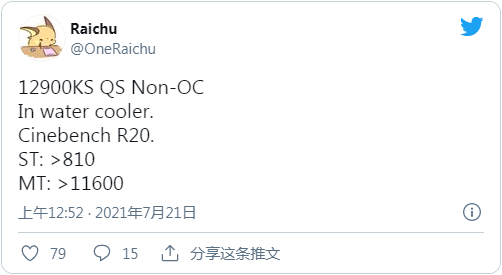 WCCFTech 援引 @OneRaichu 分享的消息称,传说中的英特尔 12 代酷睿 i9-12900KS 旗舰处理器(QS 版本),在默频 + 水冷散热的条件下,拿下了领先 AMD 锐龙 R9-5950X 达 25% 的 Cinebench R20 单核基准测试成绩。