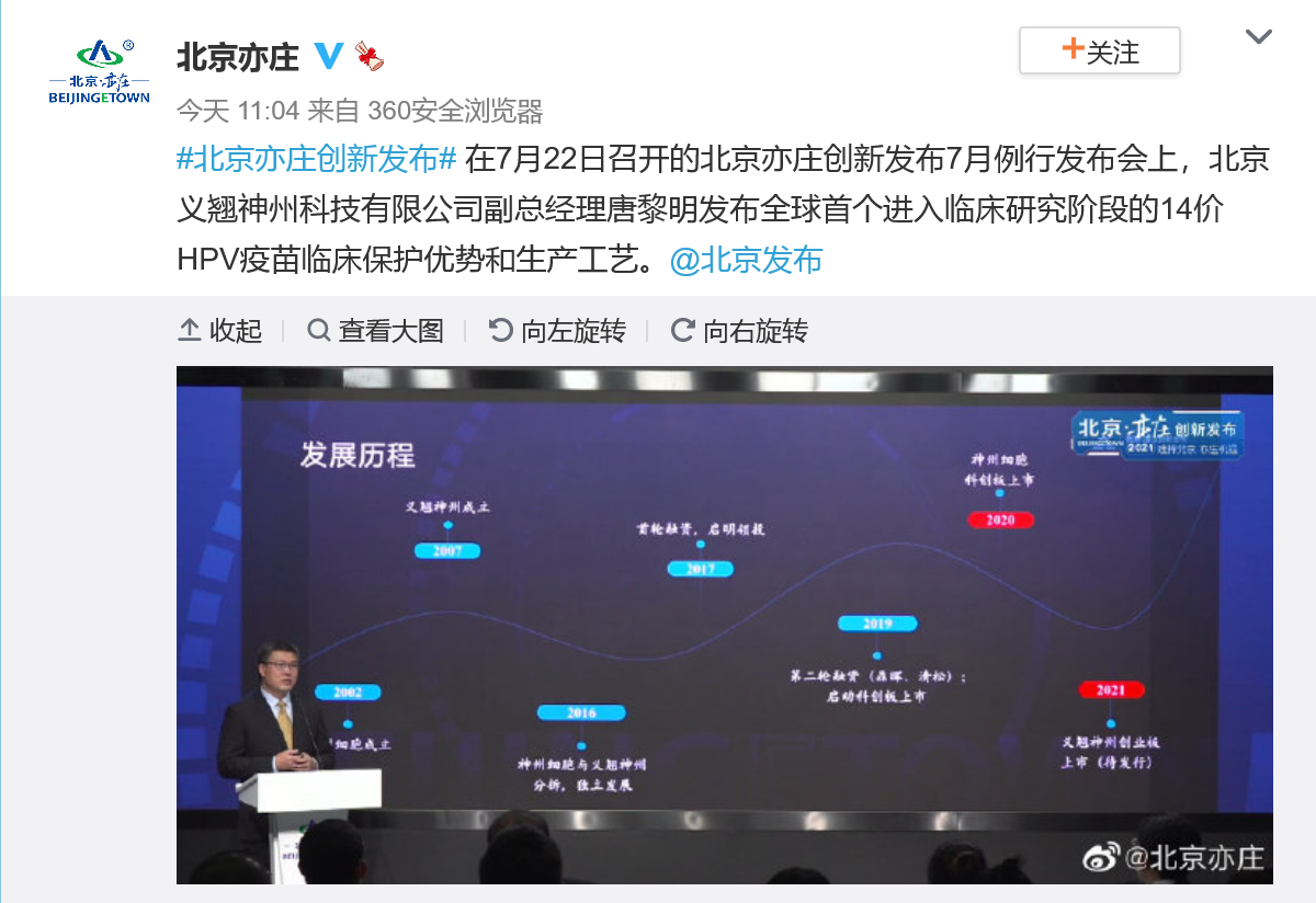 在7月22日举行的北京亦庄创新发布会上,神州细胞首次对外公开发布由其研发的全球首个14价HPV疫苗进入临床。神州细胞研发的全球首个14价HPV疫苗覆盖WHO公布的全部12个高危致癌HPV病毒型和2个最主要导致尖锐湿疣的HPV病毒型,比进口9价疫苗增加5个病毒亚型保护,将用于预防因感染HPV引起的宫颈癌、尖锐湿疣等。