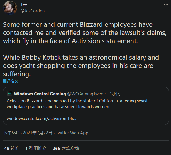 游戏科技著名媒体人Jez Corden在推特上发推,表示公司公告所说完全不对。推文说道:“暴雪的一些前任和现任员工联系了我并证实了诉讼中的一些说法,这些说法与动视暴雪的声明背道而驰。Bobby Kotick(动视暴雪现任CEO)拿着天文数字的薪水去购买游艇,但是他应该照顾的员工却在受苦。”