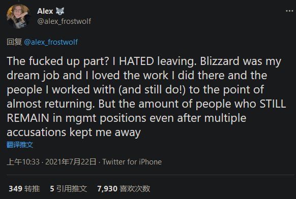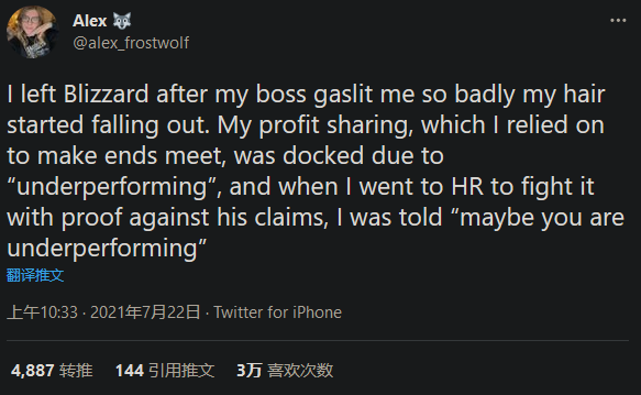 现就任于重生工作室,《APEX英雄》社交账号负责人Alex“Frostwolf” Ackerman,也曾就任于暴雪。她也发帖表示,自己也曾受上司欺压:“我在上司气的我开始掉头发以后离开了暴雪。我赖以生存的利润分成也因为我‘表现不佳’而搁置,当我去HR提出发对上司主张并带有证据时,我被告知‘也许你的确表现不佳’。”