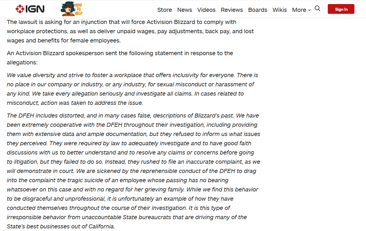 随后动视暴雪公司向包括IGN在内的多家媒体发布公告,回应该起诉。