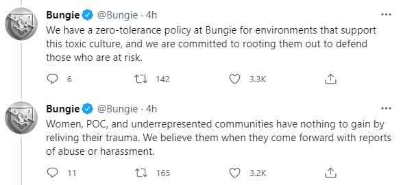Bungie在第一条推特中强调:“Bungie公司旨在尊重职员的权利,不管你是谁,你来自哪里,你自己如何定义自己的身份。我们有责任承认、反思并尽我们所能来抵制游戏行业中普遍存在的职场性骚扰、侮辱以及畸形的公司文化。”
