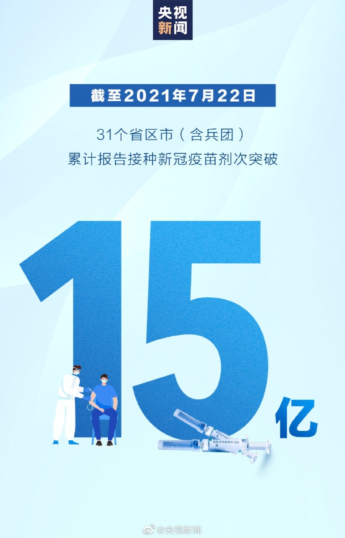 据国家卫健委最新通报,截至2021年7月22日,31个省(自治区、直辖市)和新疆生产建设兵团累计报告接种新冠病毒疫苗150760.5万剂次,突破15亿剂次大关。3月27日,我国新冠疫苗接种突破1亿剂次,然后用时25天达到2亿、16天达到3亿、9天达到4亿、7天达到5亿,之后每五六天就增加1亿,尤其是从11亿到12亿只用了短短4天。