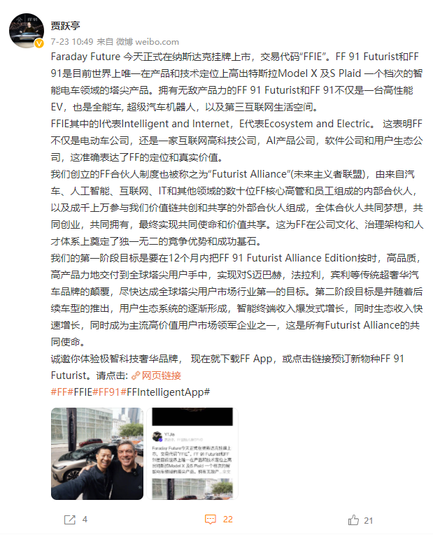 此前贾跃亭罕见在微博高调宣传FF91。