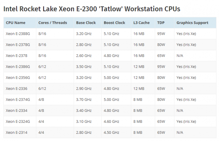 型号方面,已知有多达10款,旗舰型号至强E-2388G,8核心16线程,频率3.2-5.1GHz,三级缓存16MB,集成Iris Xe核芯显卡,热设计功耗95W。