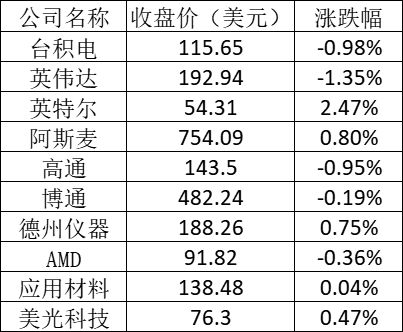 美股中的主要芯片股表现如下: