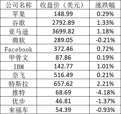 大型科技股普遍上涨,苹果、Google、亚马逊、Facebook和奈飞股价均上涨,其中Google和亚马逊涨幅超过1%;微软股价下跌,但跌幅不超过1%。