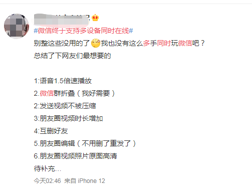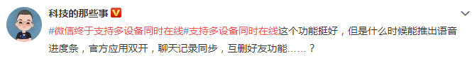 也有人称,微信当下最需要做的,就是实现双向删除好友、语音进度条、官方应用双开等等等等的功能需求,解用户真正的燃眉之急: