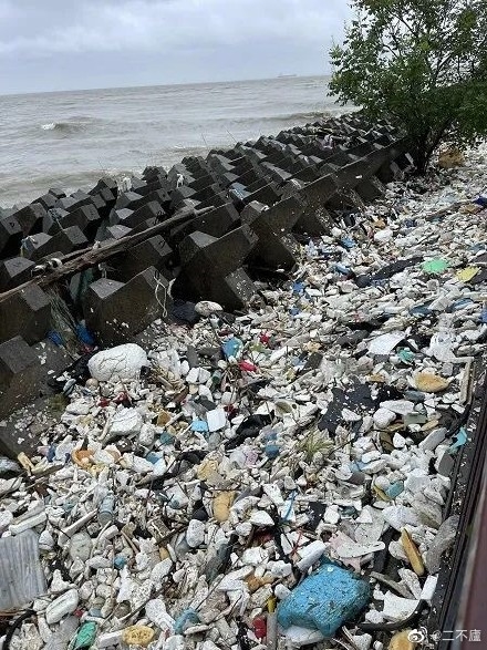 更触目惊心的是,待到潮水稍退,亲水平台外的江堤上留下了一大堆“大自然的回礼”——江中大量垃圾被冲上堤岸,江堤一夜变成了堆场。照片下,不少网友唏嘘不已,有人倡议将垃圾制作成雕塑,永久竖立在江边,以此呼吁游客保护环境。