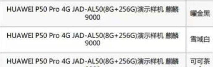 值得一提的是,下午还有网友曝光了华为P50系列演示样机的列表,其中赫然显示,华为P50 Pro将推出4G机型,搭载麒麟9000芯片(4G版本),拥有8GB+256GB存储组合,并且至少拥有曜金黑、雪域白、可可茶三款配色。